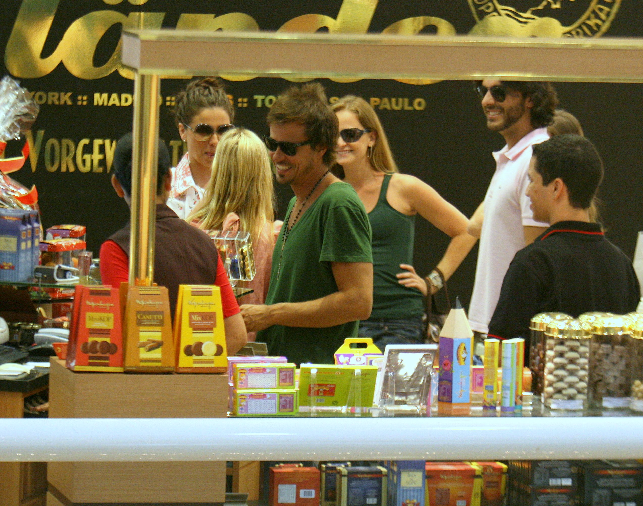 Para disfarçar e continuar com ar de celebridade, os quatro atores não tiraram os óculos de sol — mesmo sendo dentro de um shopping!